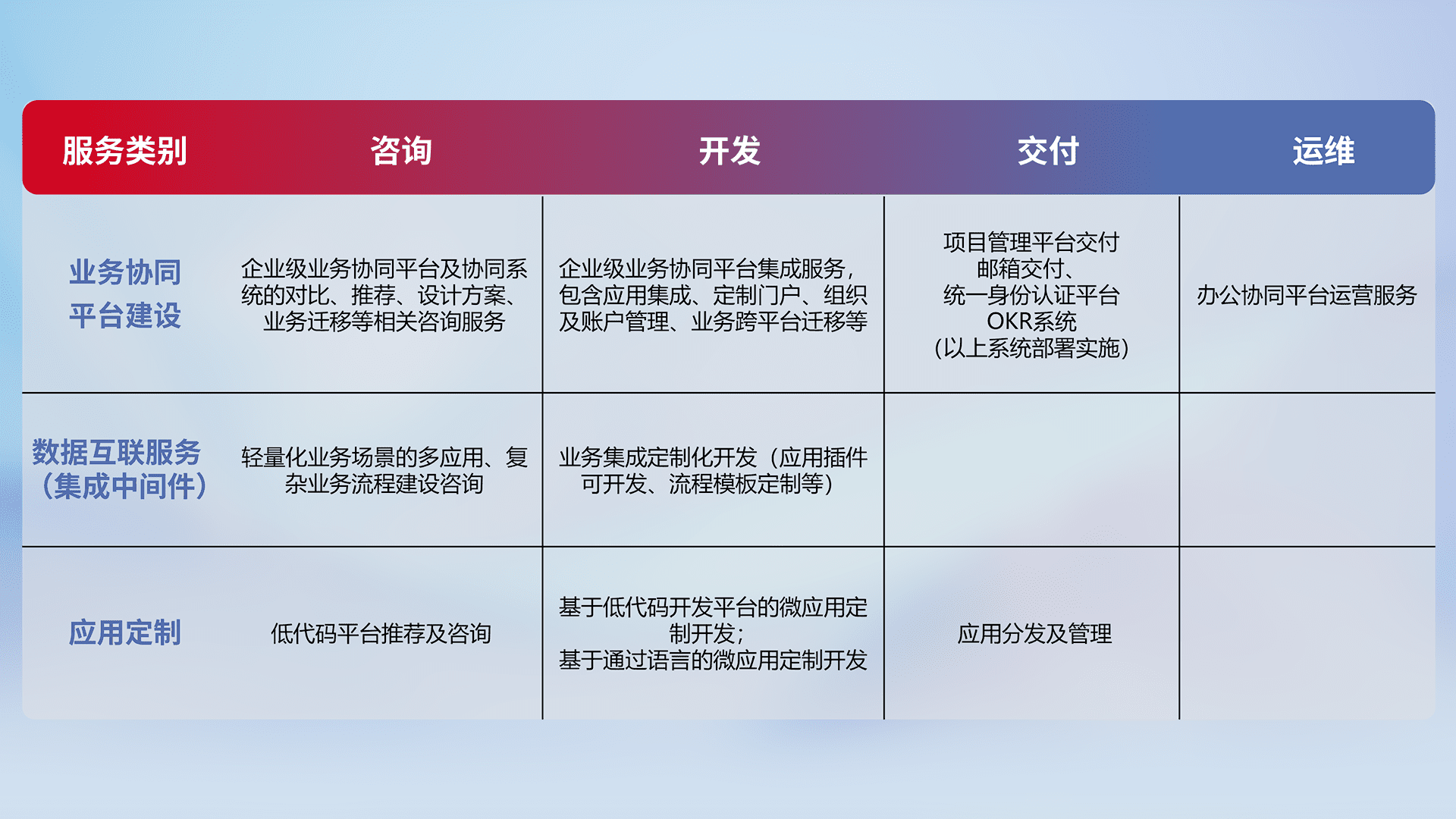 针对钉钉、、企微、、、、IDaas等平台级产品提供产品的规划、、、方案、、交付、、、、定制化开发等服务,,,,实现如统一协同办公、、智能客户服务、、、混合会议管理、、、智能数据查询、、、等业务场景,,,实现数字化转型。。