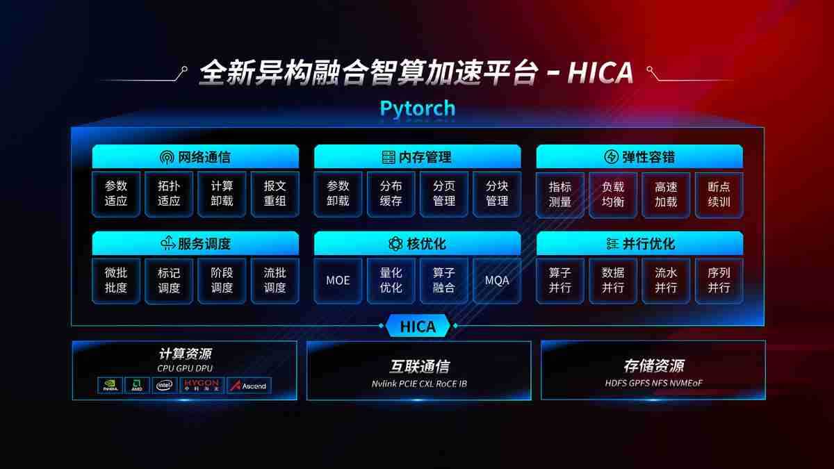 通过自研的服务层、、、、中间适配层、、、以及调度编排算法,,采用数据并行、、模型并行等多种并行方式,,把并行计算任务进行有效的分解,,,,使其分别由相应的软件栈和算力资源来承接。。当GPU资源变化,,HICA可以实时动态调度计算子任务并调整模型拓扑和架构,,以充分聚合各种算力资源。。